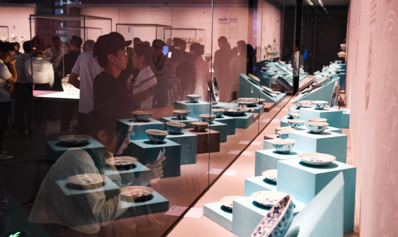 观众在参观一号沉船遗址出水的红绿彩碗。新华社记者 杨冠宇 摄