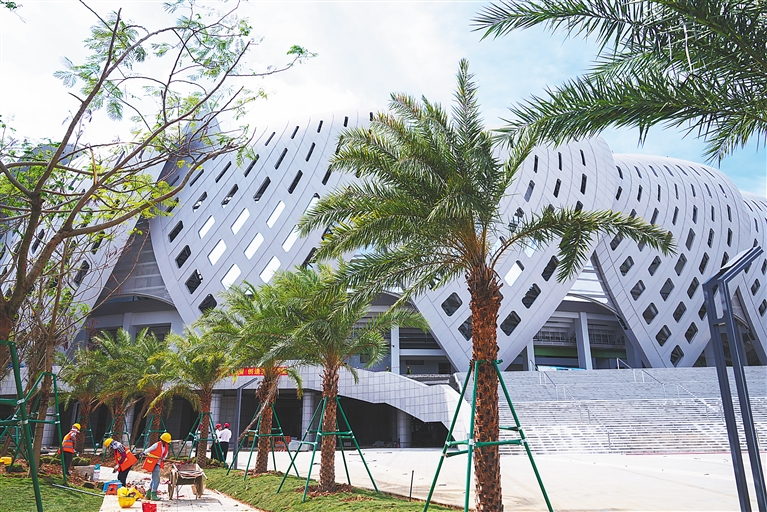 8月7日,在琼海市文体中心项目现场,施工人员在进行收尾施工。