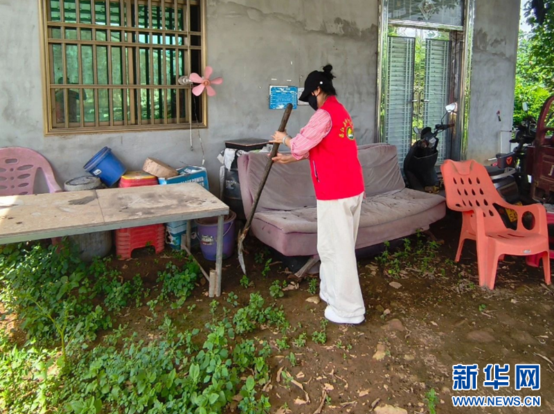 昌江黎族自治县的家庭健康指导员走村入户,帮助居民清理卫生死角。新华网发