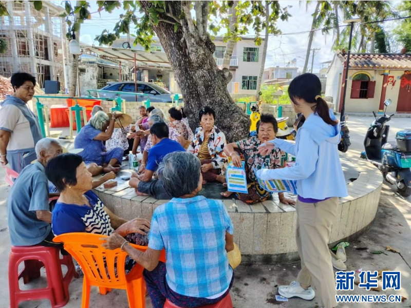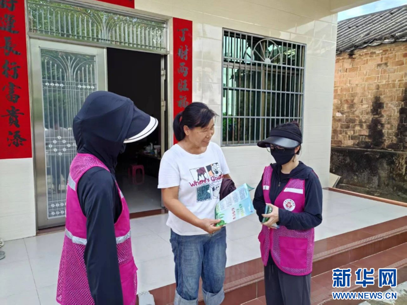 陵水黎族自治县的家庭健康指导员走村入户,向辖区居民发放基孔肯雅热媒介伊蚊控制⼩知识宣传折页。新华网发
