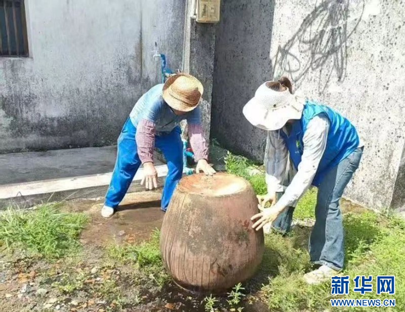 文昌市的家庭健康指导员协助辖区开展“搬盆倒罐行动”。新华网发