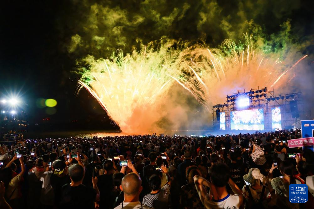 暑期,游客在儋州市海花岛旅游度假区观看烟花秀。新华社发