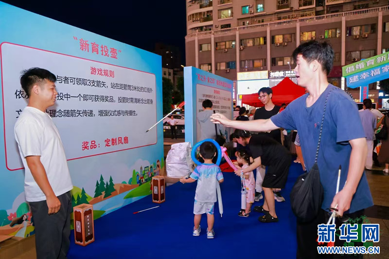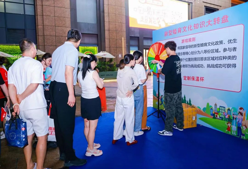 互动体验游戏区趣味十足,“新型婚育文化知识大转盘”“家之形・爱之印”指压板挑战赛、“新育投壶”等游戏,巧妙地将婚育文化理念融入其中,增强了市民对婚育知识的了解,提升了对家庭情感价值的认同。