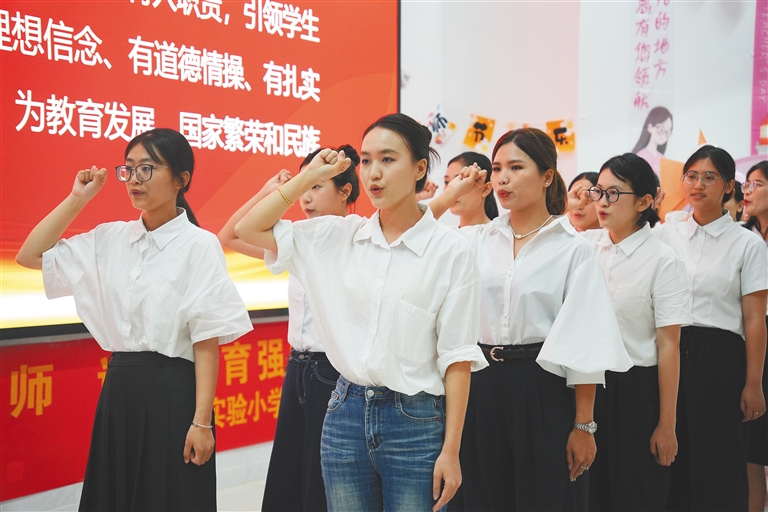 9月10日,海口市西秀实验小学举行庆祝第41个教师节暨先进表彰大会,20余名新教师庄严宣誓。海南日报全媒体记者 张茂 通讯员 王倩倩 图/文