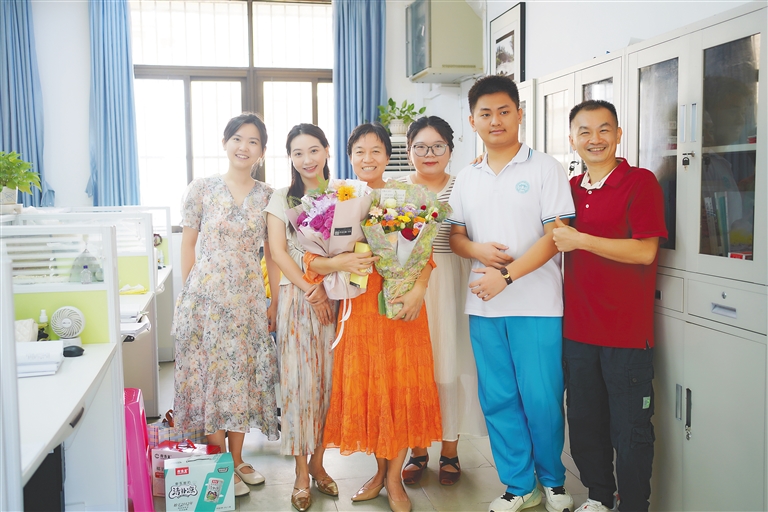 一旁,还有从教20余年的教师莫礼安、“95后”教师薛英子,以及刚入职的“00后”教师袁晗之,他们都是汪晓风的学生。“老师将青春奉献给了学校和我们,下个月她就要退休了,希望能陪她再过一个教师节。”陈盈盈说。