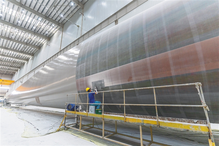 在明阳东方基地生产车间内,工人进行超大型叶片组装作业。海南日报全媒体记者 袁琛 摄