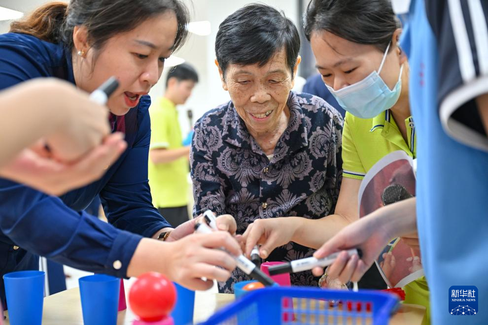 10月29日,在海口市琼山区国兴街道综合养老服务中心,老年人和工作人员、志愿者一起做游戏。新华社记者 郭程 摄