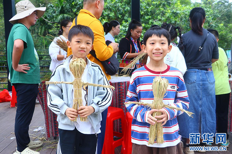 小朋友在镜头前展示用稻草做的手工作品。新华网发(邓婕 摄)