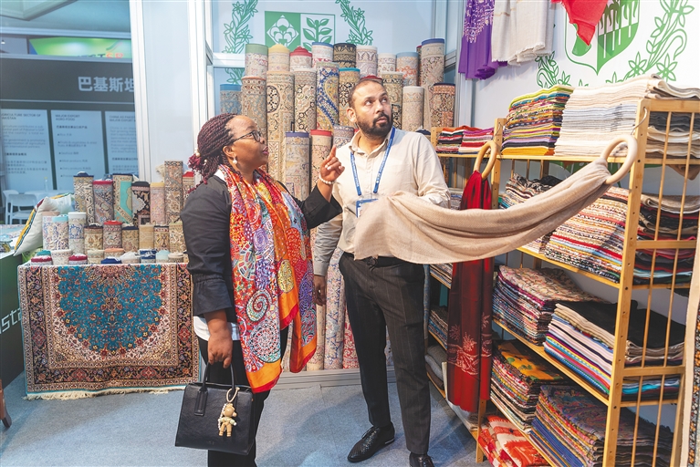 12月4日,在冬交会主宾国之一的巴基斯坦馆,来自乌干达的参展商在选购商品。海南日报全媒体记者 袁琛 摄