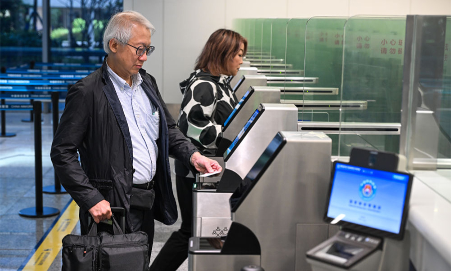 入境旅客在海口美兰边检站使用快捷通道通关。(杨冠宇 摄)