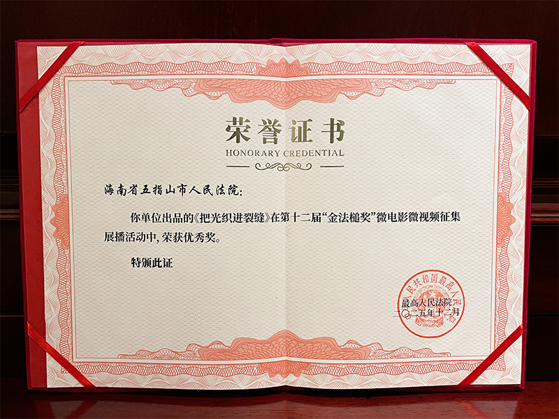 12月17日上午,第十二届“金法槌奖”微电影微视频暨2024年度全国法院“十佳百优”新媒体账号作品颁奖式举行。五指山市人民法院报送的作品《把光织进裂缝》荣获“金法槌奖”微视频组优秀奖。