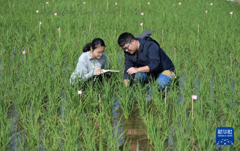 2月10日,在海南省三亚市崖州湾科技城国家耐盐碱水稻技术创新中心科研试验基地,科研人员在调查水稻农艺性状。新华社记者 赵颖全 摄
