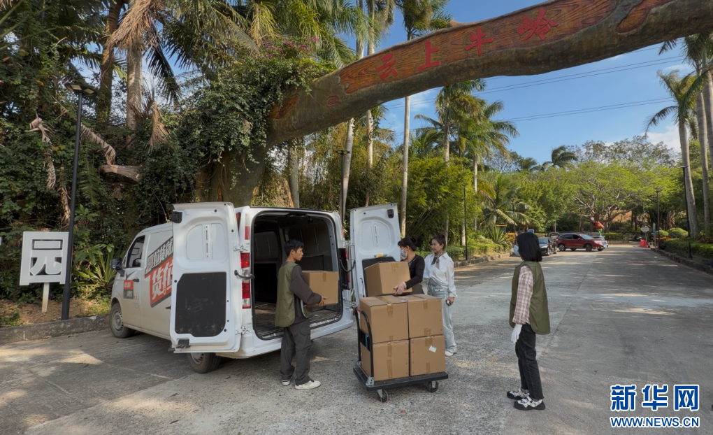 云上牛岭咖啡庄园团队搬运咖啡产品。新华网发