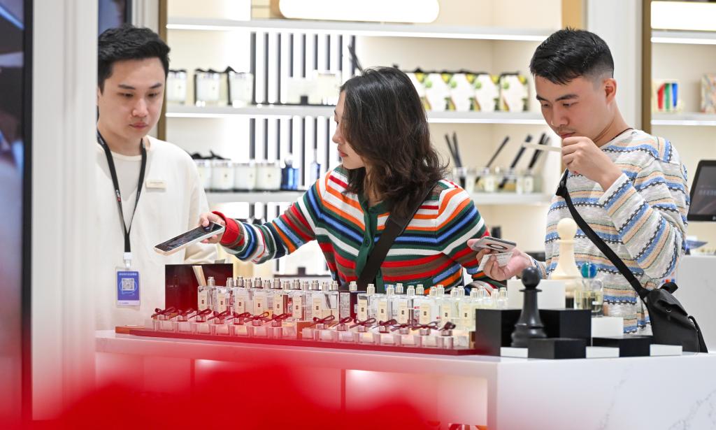 游客在中免集团海口日月广场免税店选购免税商品(1月1日摄)。新华社记者 杨冠宇 摄