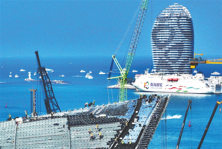 近日,位于三亚的中国海南国际文物艺术品交易中心项目施工现场,工人们干劲十足,正抢抓工期进行屋面隔热层、防水层安装等工作。据介绍,该项目总建筑面积7.4万平方米,目前整体建设完成62%,建成后将集综合办公、展示、会议、接待等功能于一体,成为三亚构建文化艺术全产业链的核心平台。海南日报全媒体记者 王程龙 摄