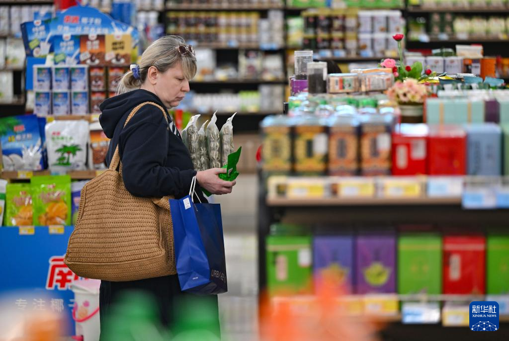 1月11日,外国游客在三亚一商场内购买茶叶。新华社记者 郭程 摄