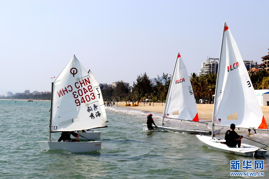 参赛选手在帆船测试赛比赛现场准备进行赛前测试。新华网发(王康宏 摄)
