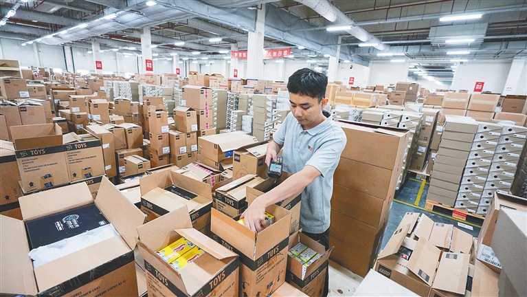 1月20日,在海口综合保税区的中免海南国际物流中心,装卸员在出库环节对免税品进行分拣作业。据悉,海南自贸港自正式启动全岛封关以来,政策红利持续释放,离岛免税消费市场热度高涨,商品数量与配送量大幅增长。