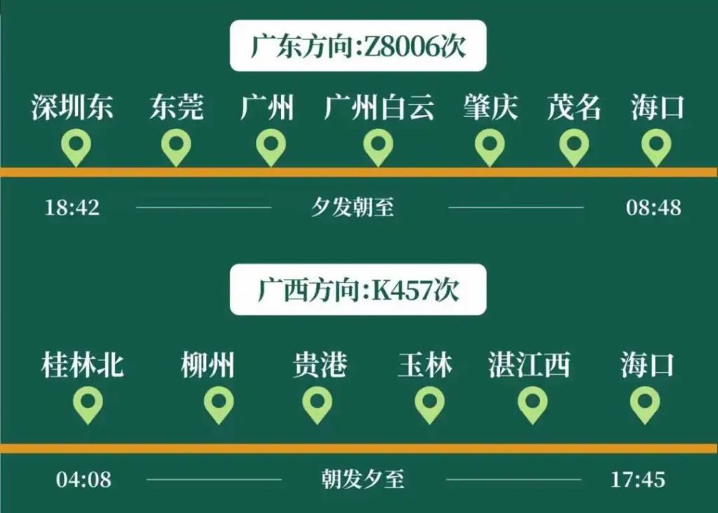 广西方向:K457次列车在广西壮族自治区内通达度高,一票直达海口,旅行节奏相对舒缓。线路途经桂林、柳州、贵港、玉林等多个广西主要城市,采用朝发夕至模式,04:08从桂林北站出发,17:45抵达海口站。