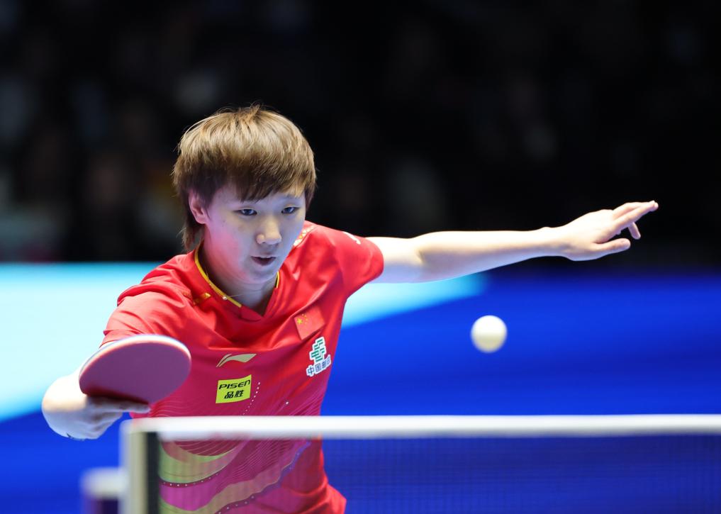 2025年5月25日,中国选手孙颖莎在卡塔尔多哈举行的世界乒乓球锦标赛女子单打决赛中。