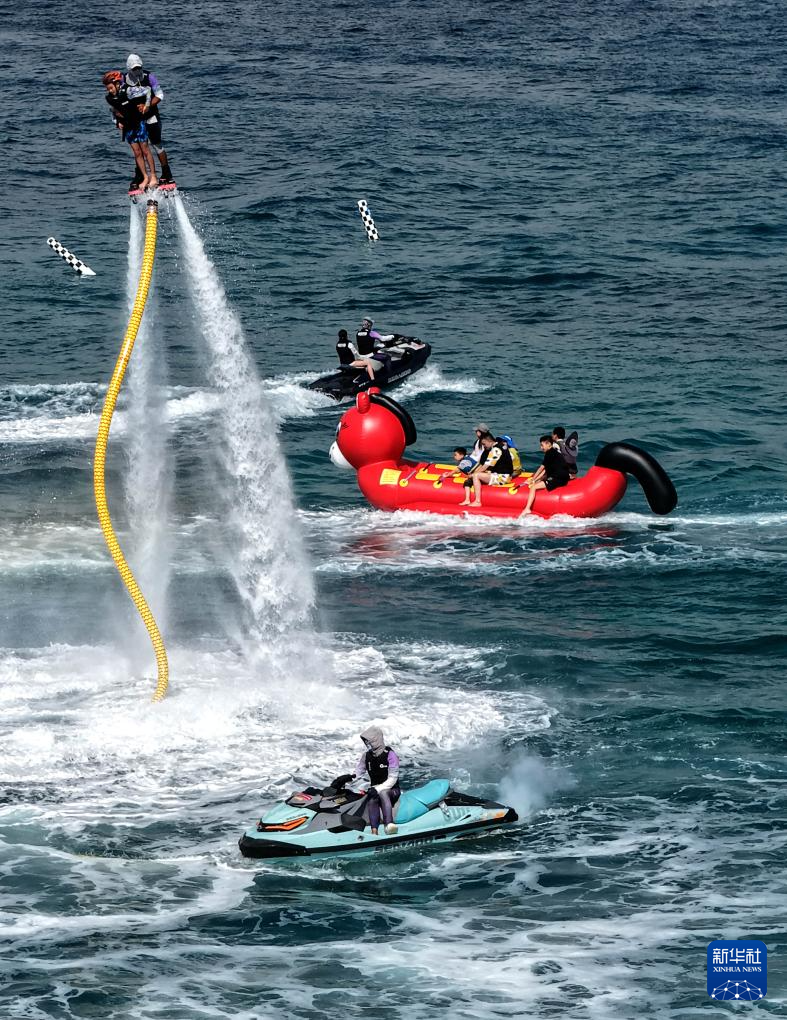 2月22日,游客在三亚市蜈支洲岛体验水上项目(无人机照片)。新华社记者 赵颖全 摄