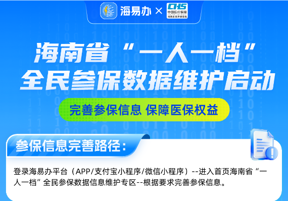 更多海南省“一人一档”全民参保数据信息维护动态,可关注“海南医保”微信公众号、视频号、抖音号,及时获取最新消息。