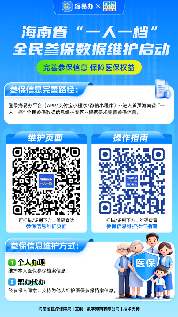 为确保数据鲜活、全面,海南省依托省数据中台、“一人一档”数据库,构建了“线上自主办理、线下辅助核实、跨部门数据共享”的立体化协同维护体系。海南省参保人可通过海易办平台(App/支付宝小程序/微信小程序),进入“一人一档”全民参保数据维护专区,对个人参保信息进行确认或更新。在征得他人同意的前提下,也可协助家人或亲友完成信息维护,共同织密医保数据网络。对于线上操作不便或需辅助核实的群体,基层网格员与医保服务站工作人员也将提供线下协助。